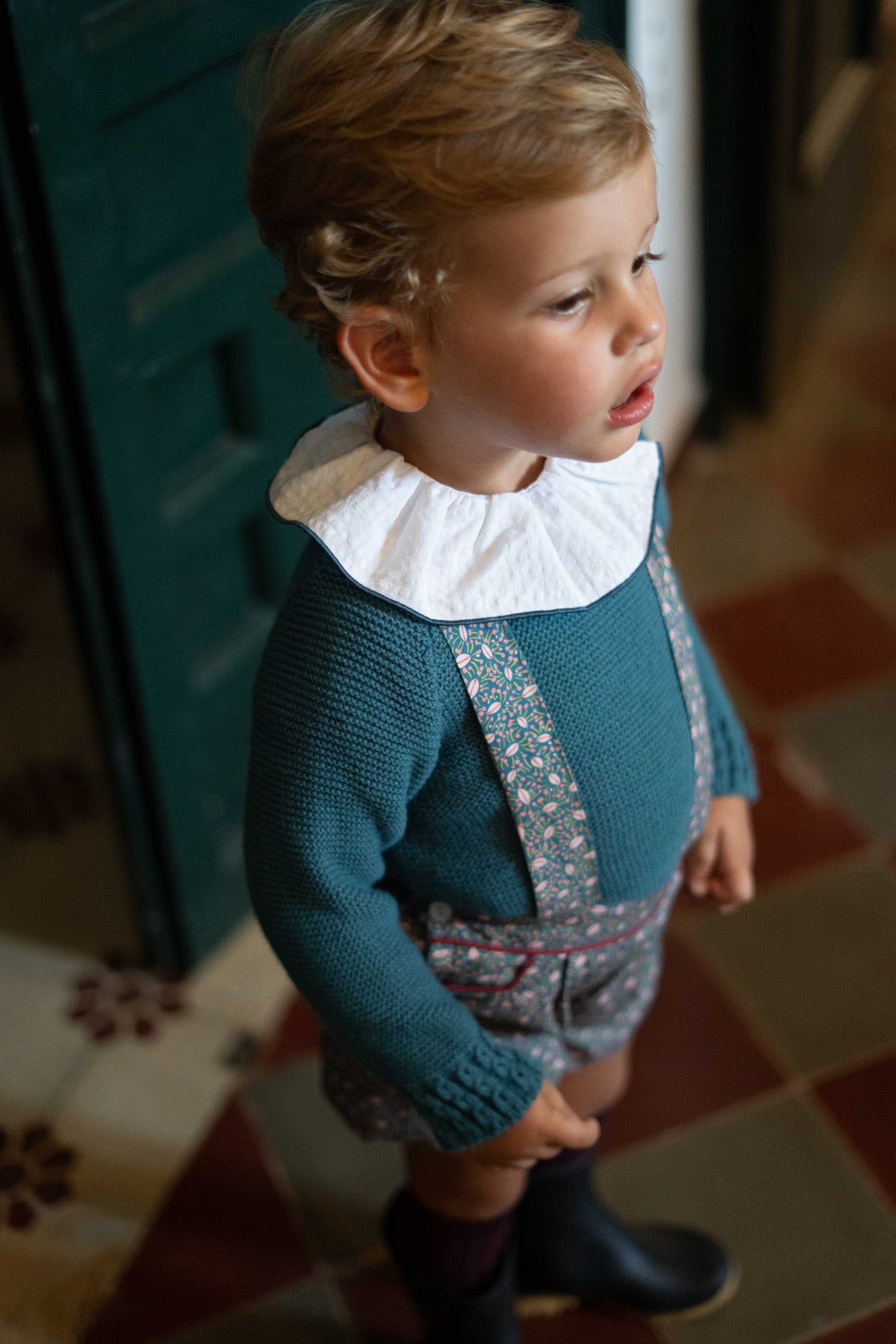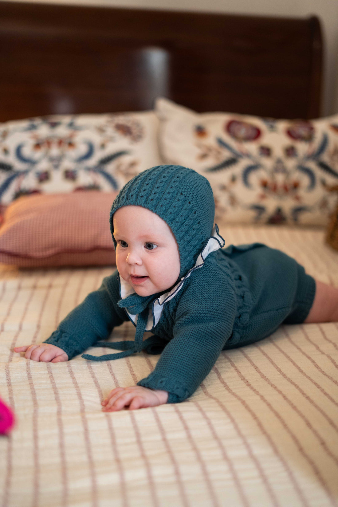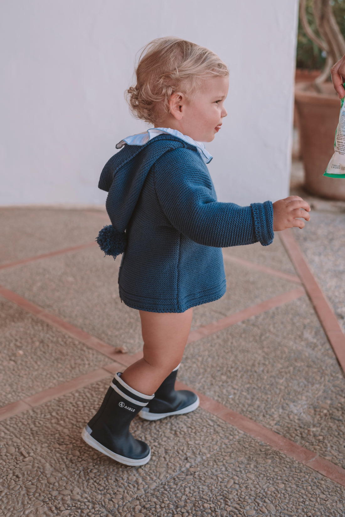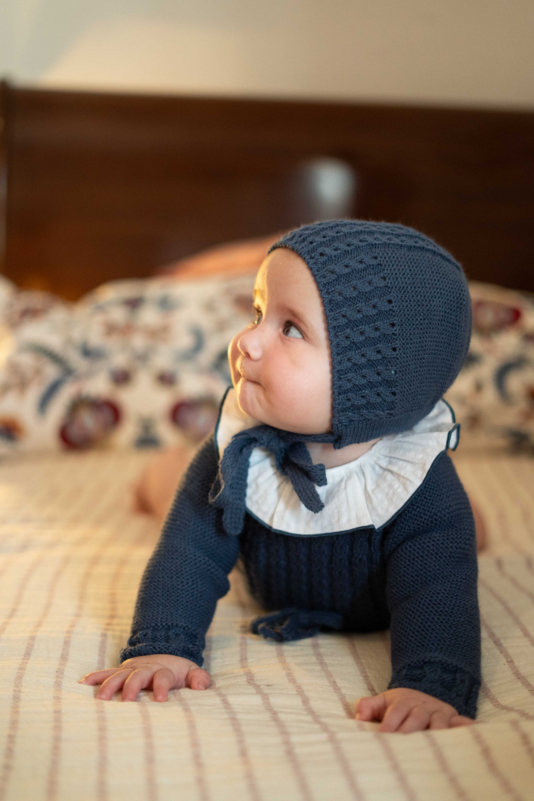 Capota de punto color océano con detalle de ochitos, ideal para combinar con cualquiera de...