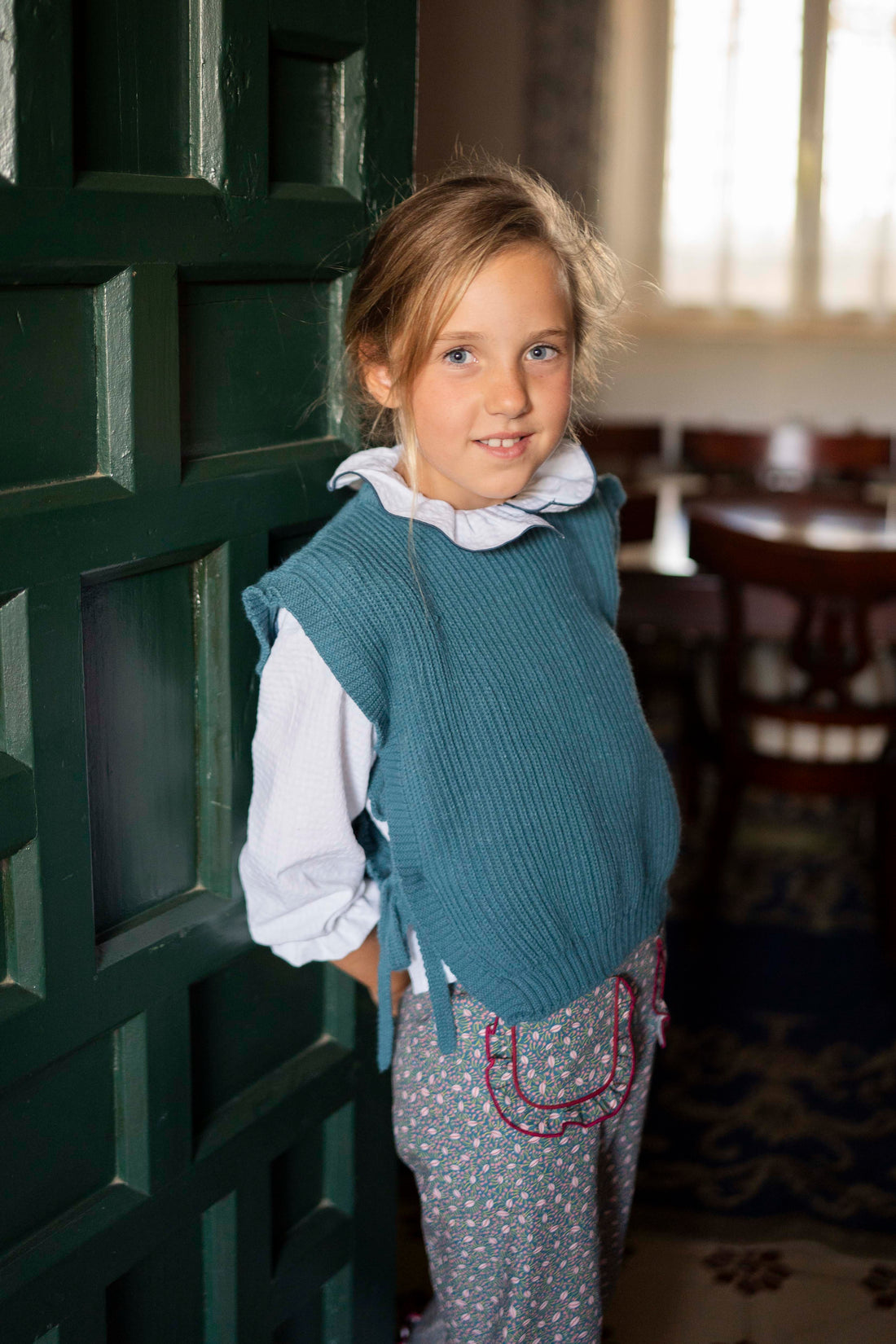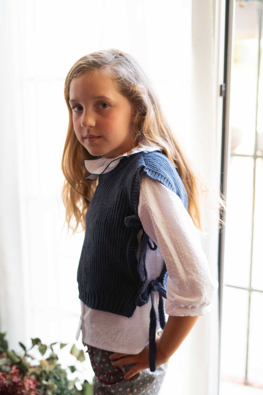 Chaleco sin mangas de punto color azul empolvado con detalle de lazos en los laterales,...