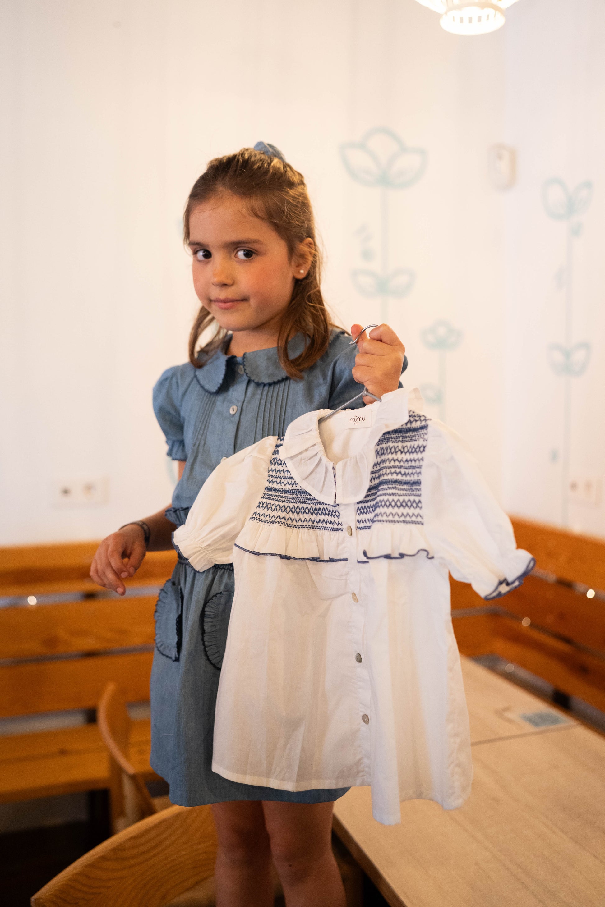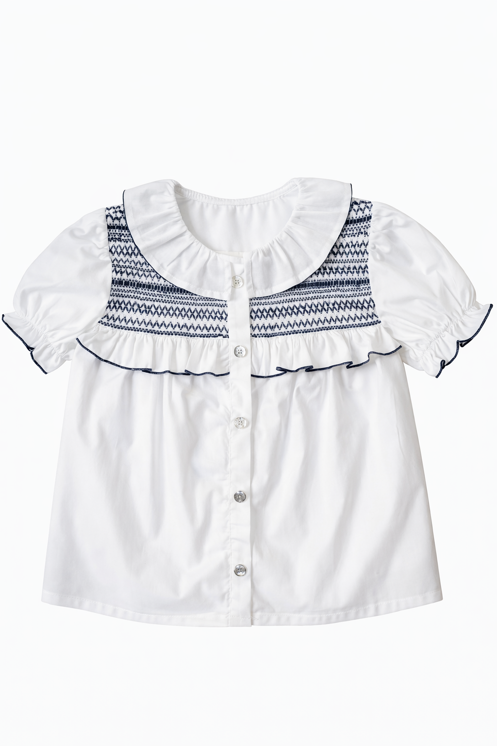 Confeccionada en 100% algodón, suave y ligero, destaca por su detalle de smock bordado en azul marino en la parte superior, que le aporta ese aire clásico renovado que tanto nos gusta. El volante horizontal en el pecho con vivo en contraste marca la diferencia y la convierte en una prenda muy cuidada.
