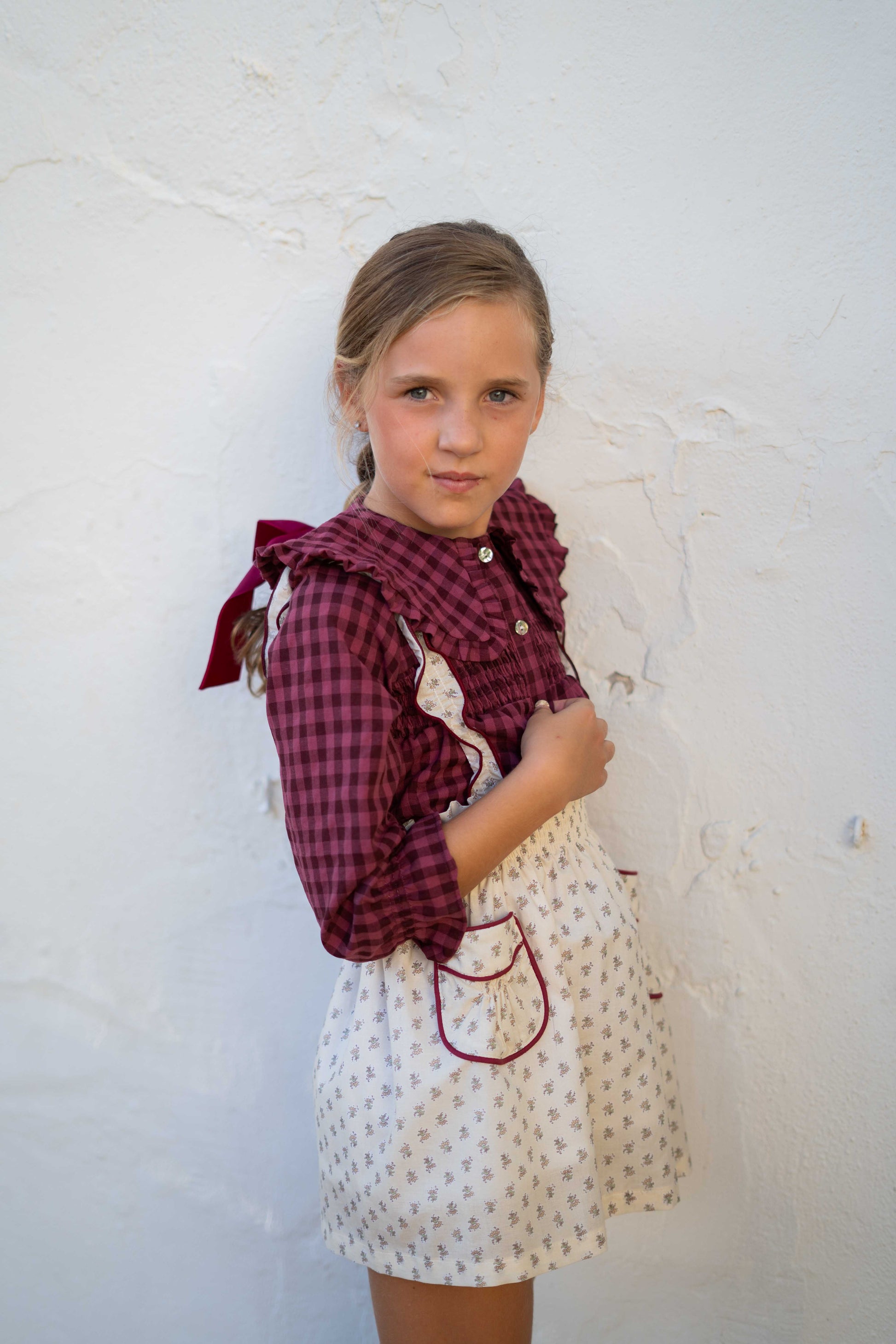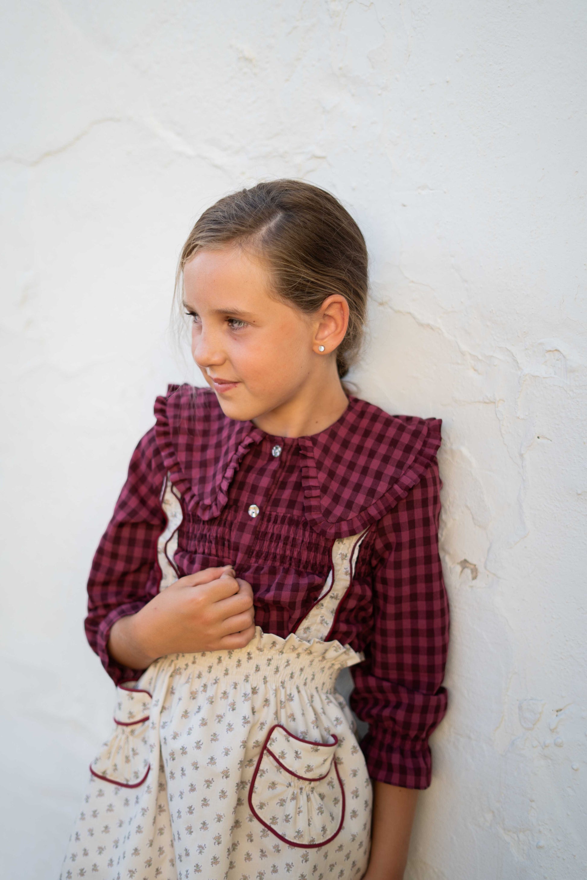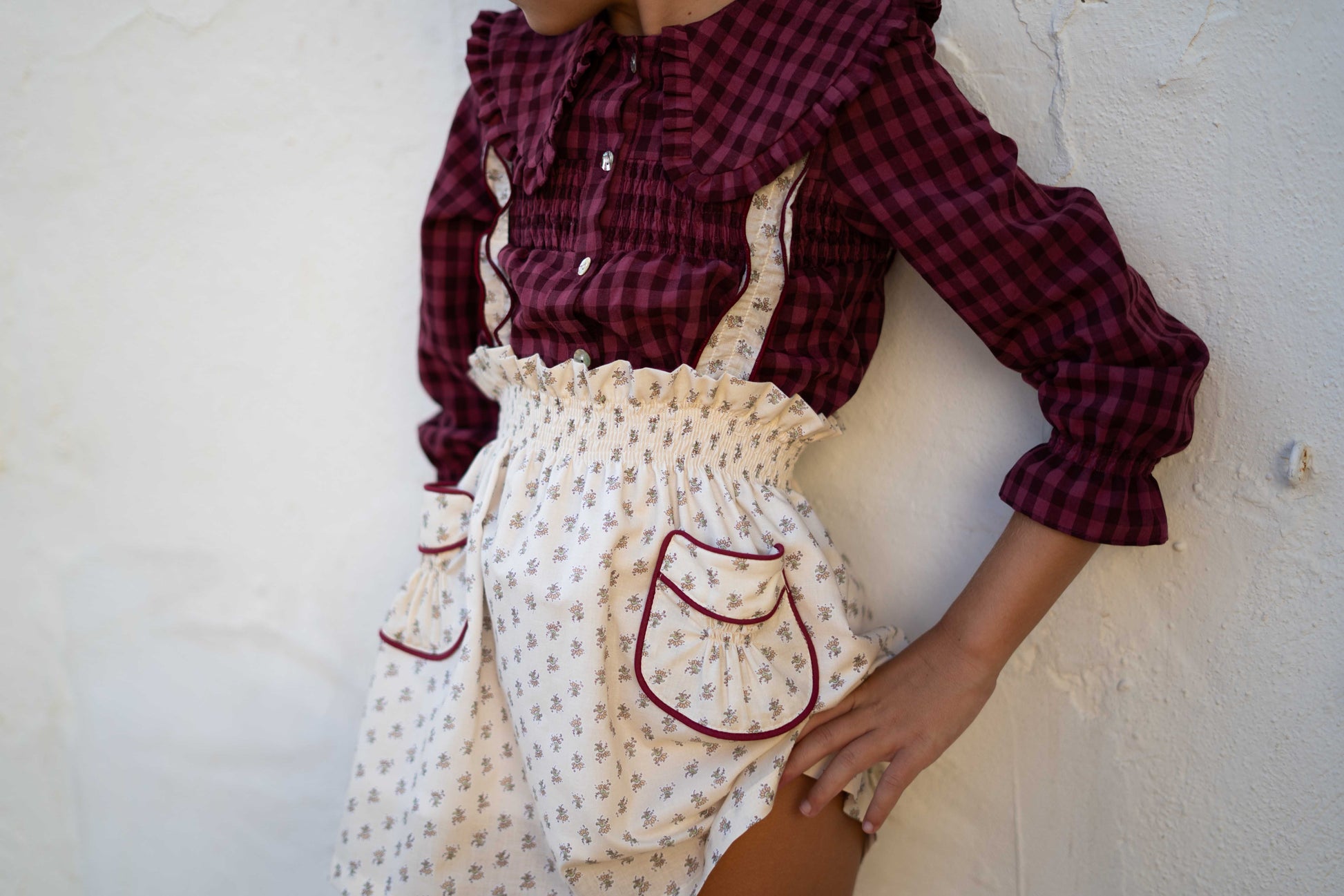 Una prenda con mucho encanto, confeccionada en tejido 100% algodón con cuadro vichy en tono guinda.
