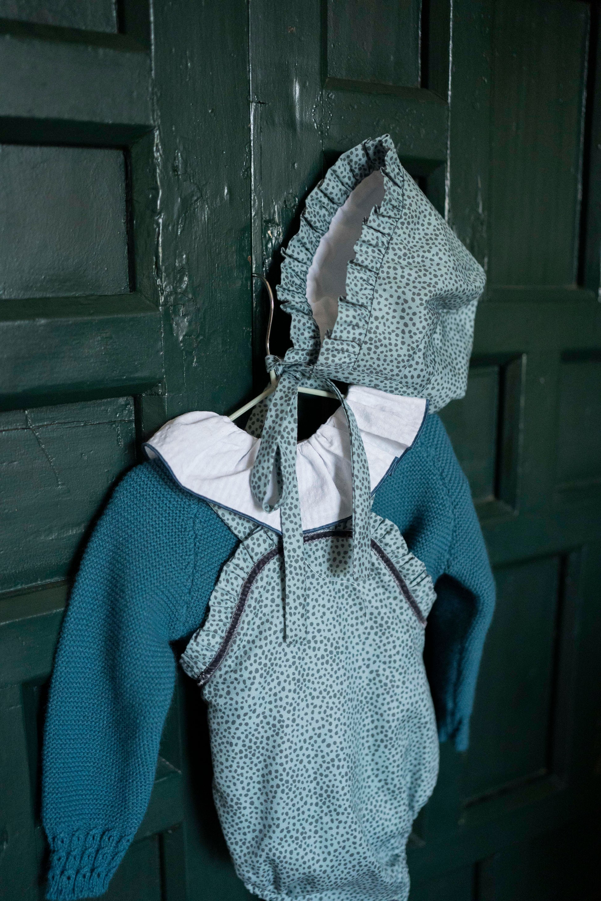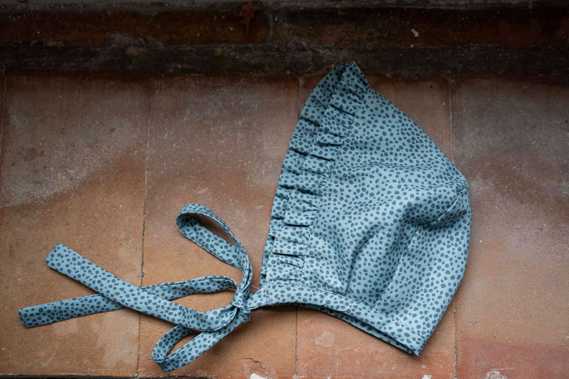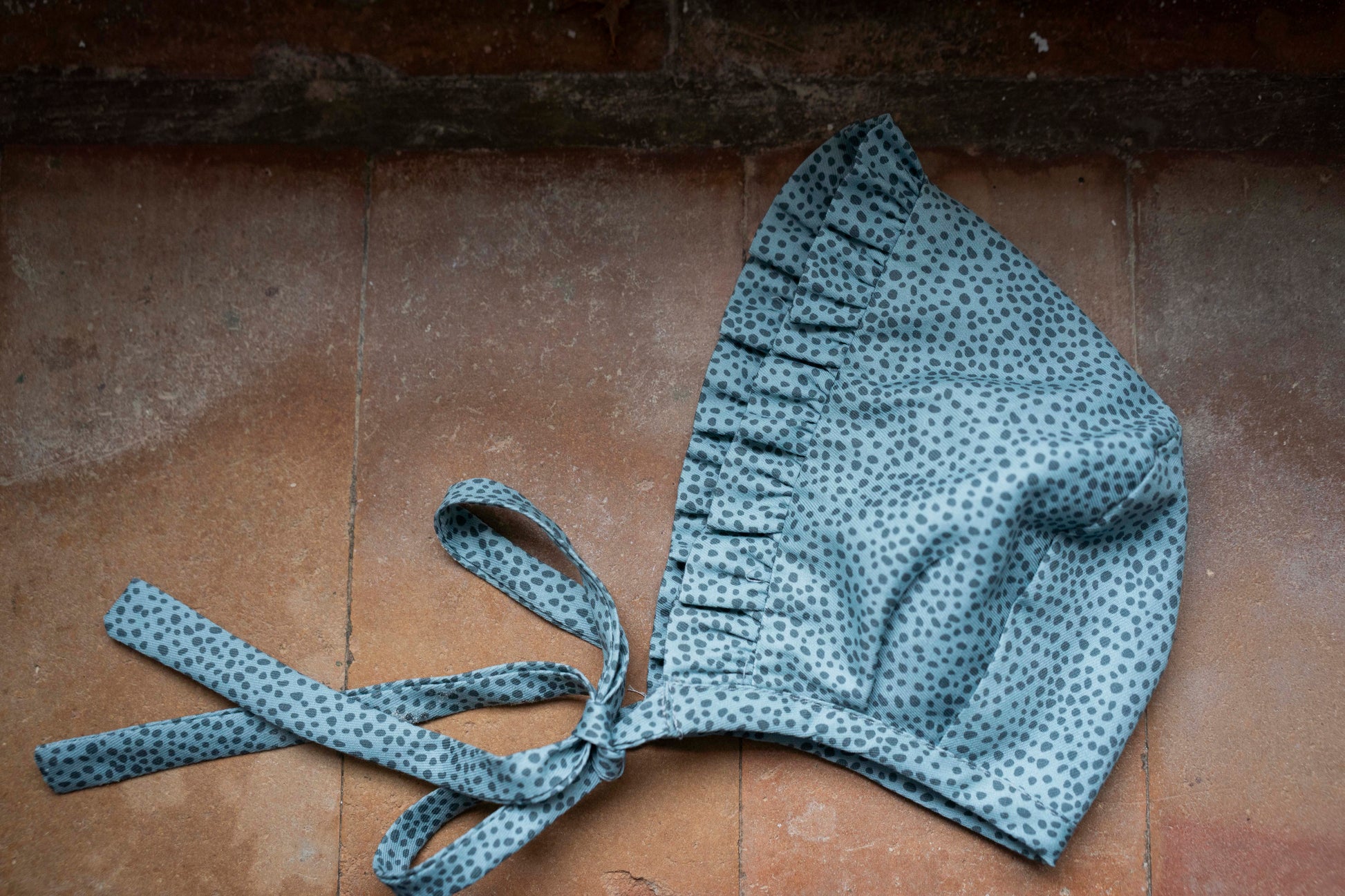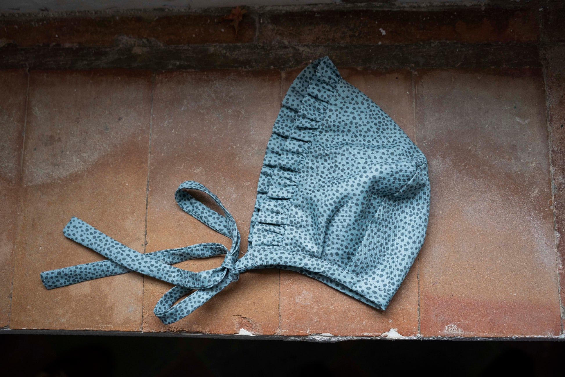 Una capota ideal para completar el look de los más pequeños. Confeccionada en tejido 100% algodón con estampado de topos, presenta un volante fruncido que enmarca el rostro y le da ese aire clásico con el toque actual que define a Mûnnu.