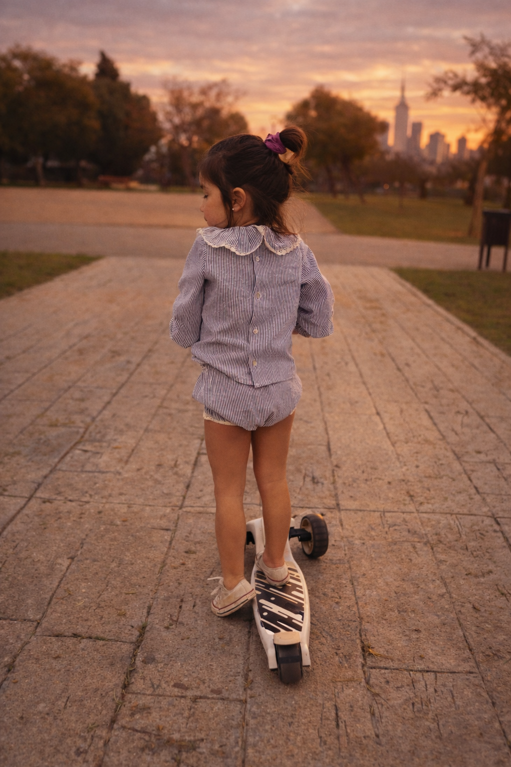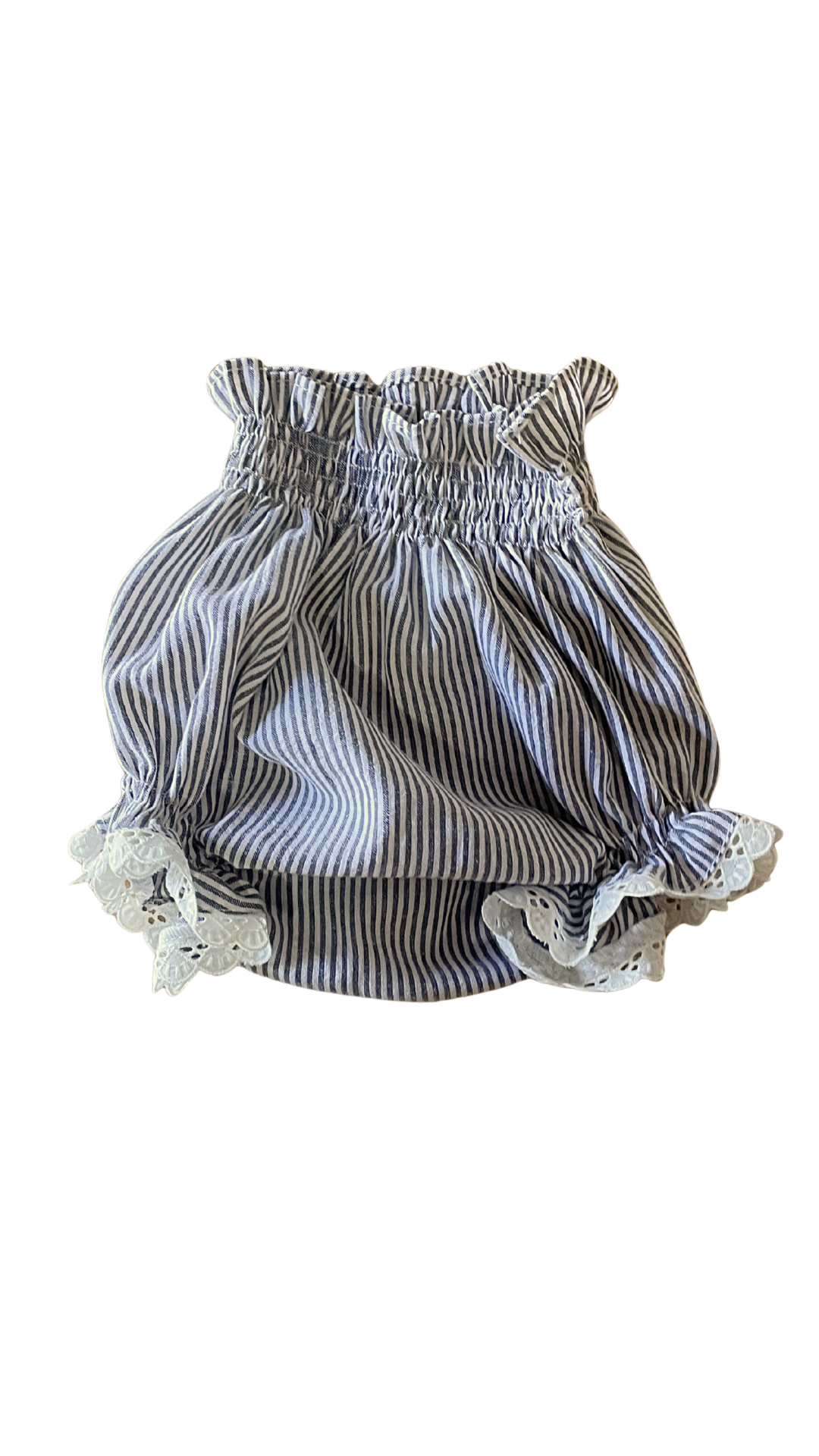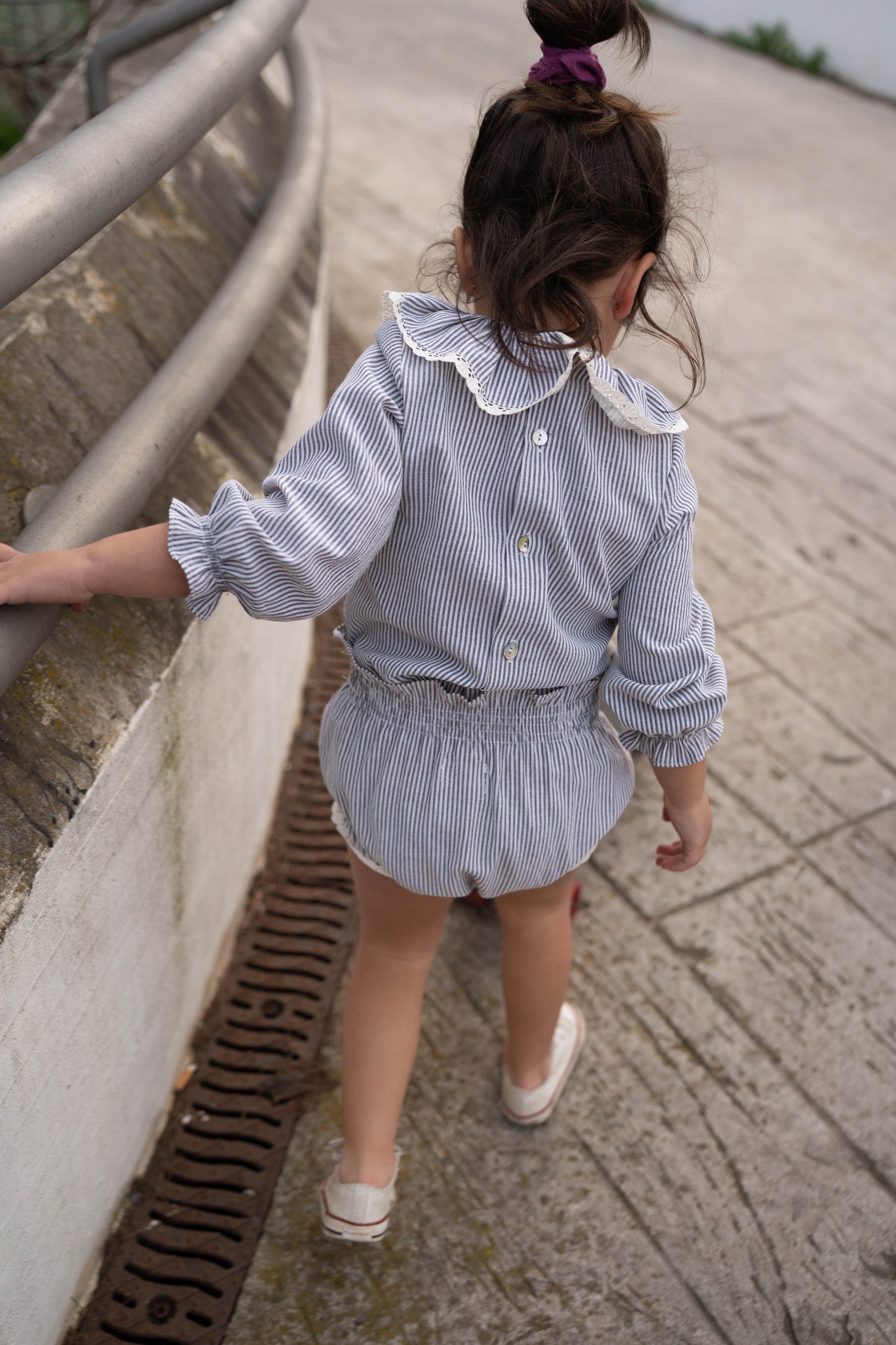 Tiene cinturilla elástica fruncida que se adapta sin apretar y volantito para terminar la prenda rematado con puntilla, que le da ese toque delicado y especial que tanto nos gusta. Queda precioso combinado con la camisa Soho bebé y la capota a juego.