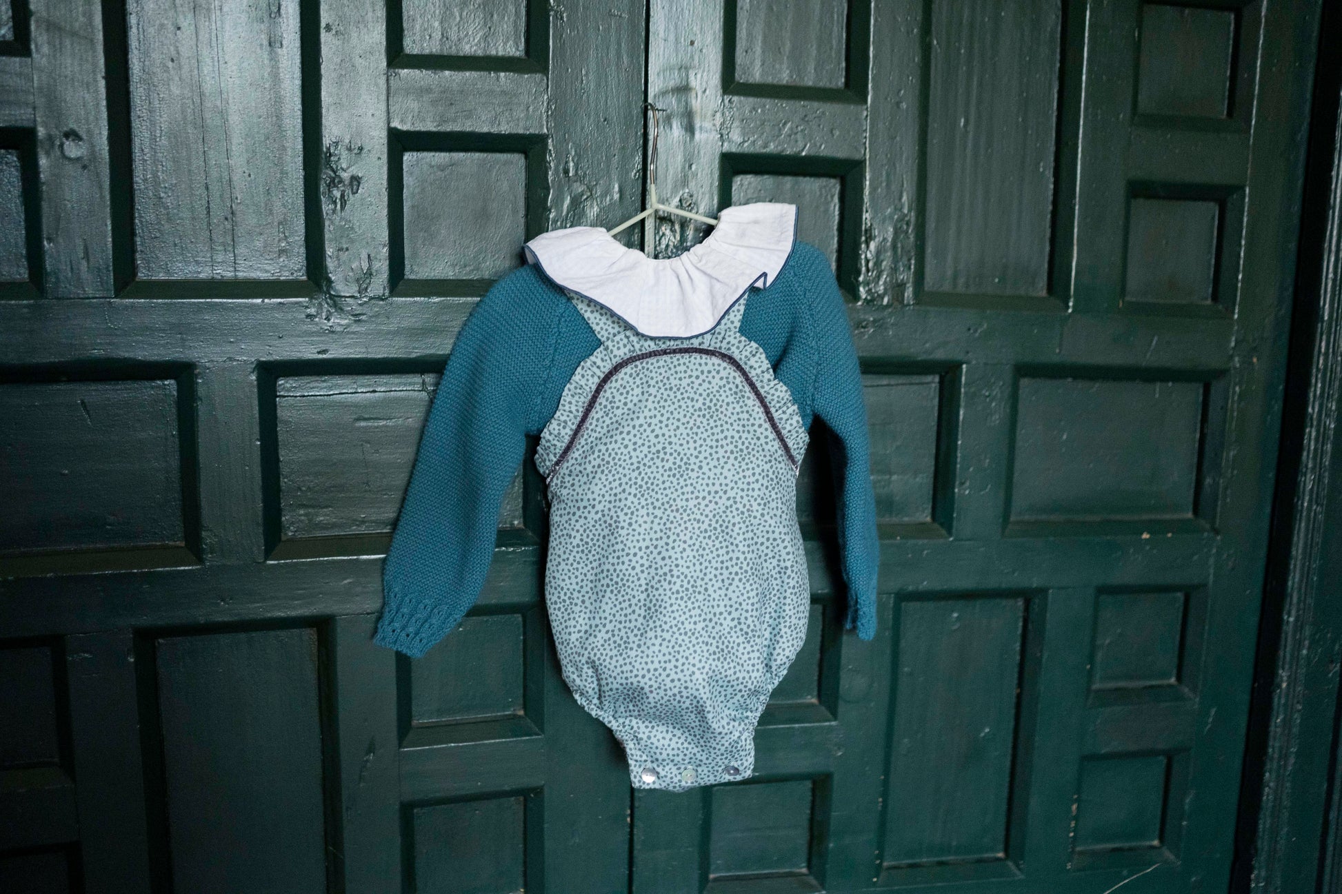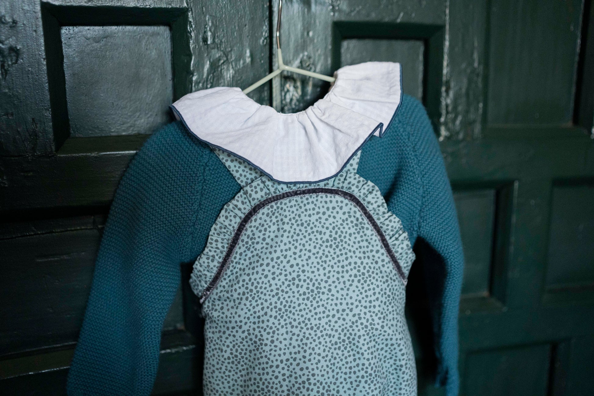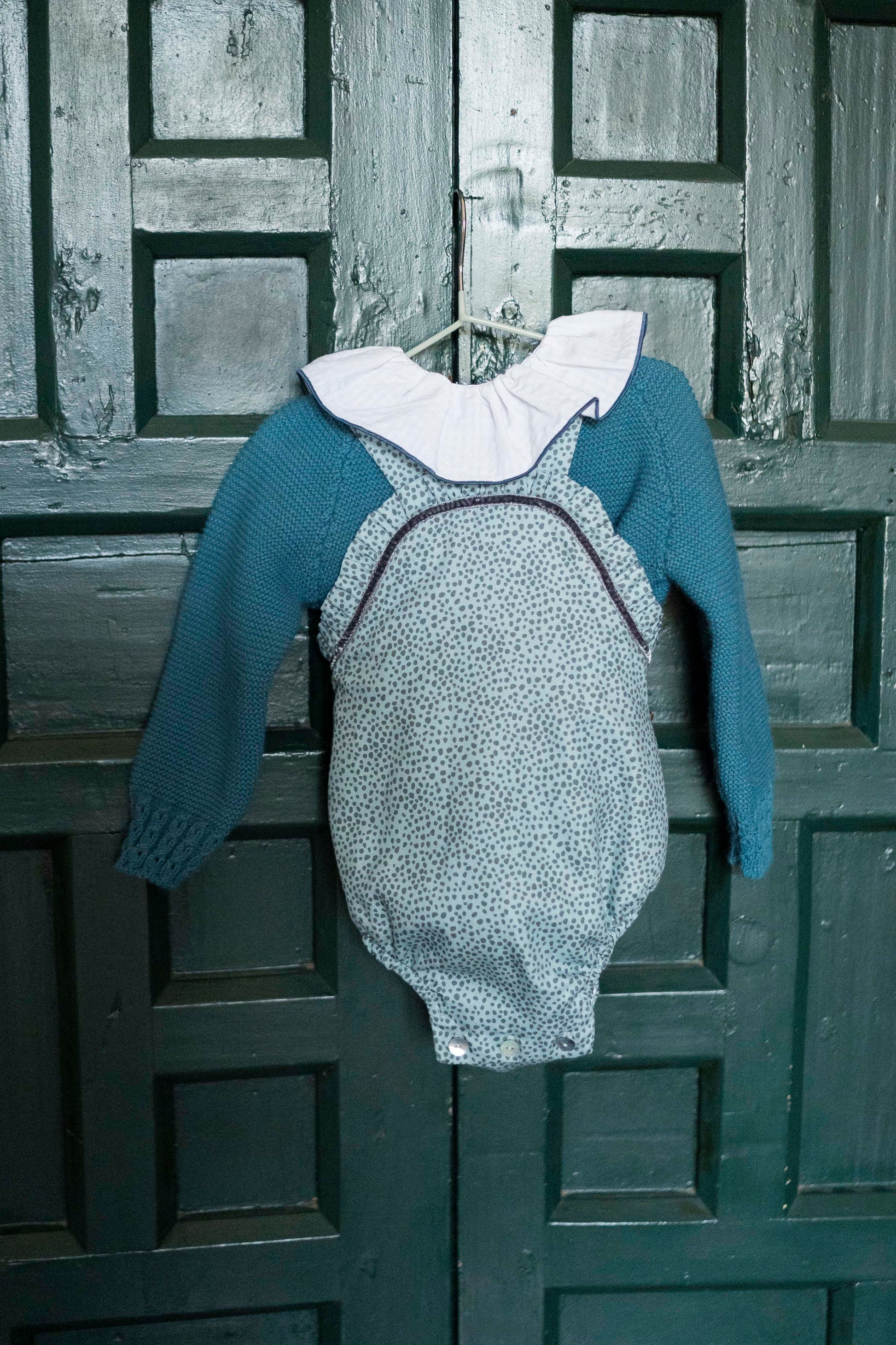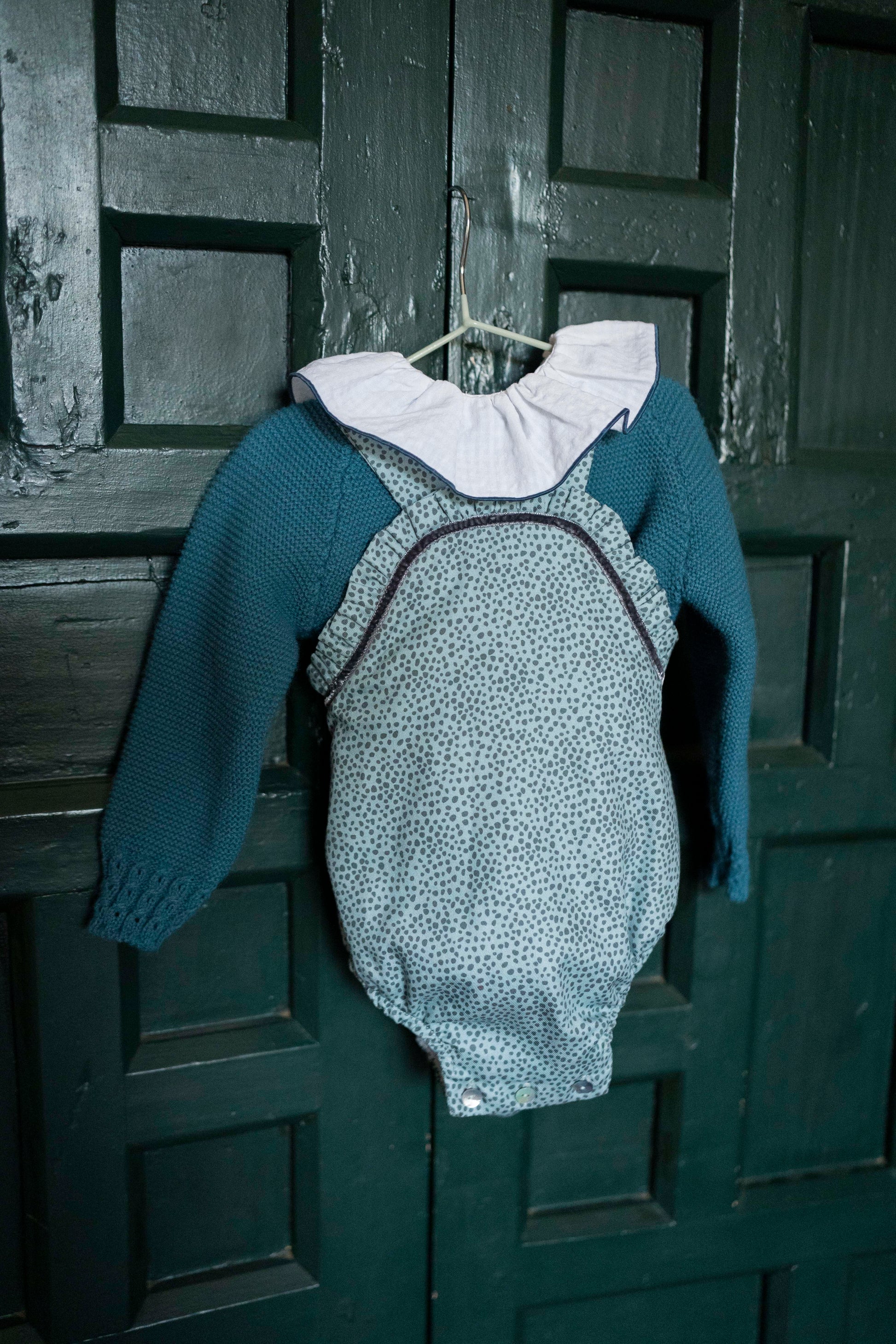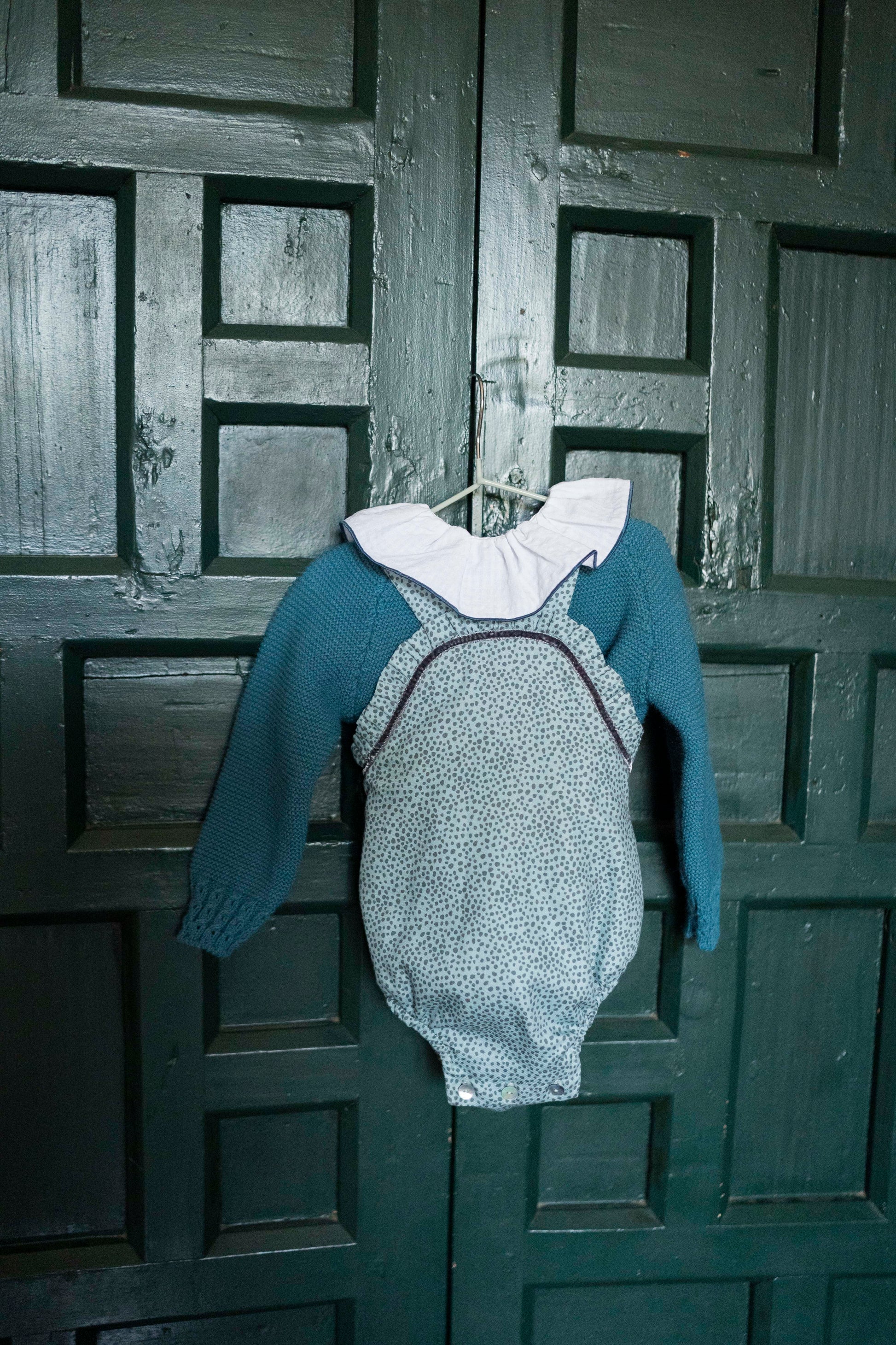Diseñada para los más pequeños, es práctica y cómoda, con cierre inferior de corchetes para facilitar el cambio y tirantes cruzados con volante decorativo. Ideal para combinar con jerseys o camisas de punto, como en la foto.