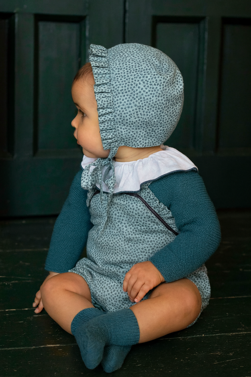 Esta ranita es pura dulzura y comodidad. Confeccionada en tejido 100% algodón, lleva un delicado estampado de topos y detalles en terciopelo verde océano que aportan un toque elegante y diferente.