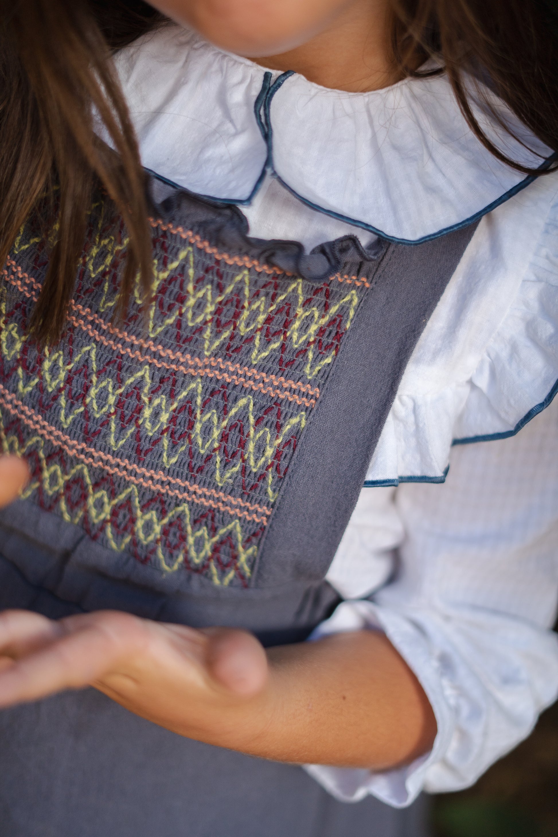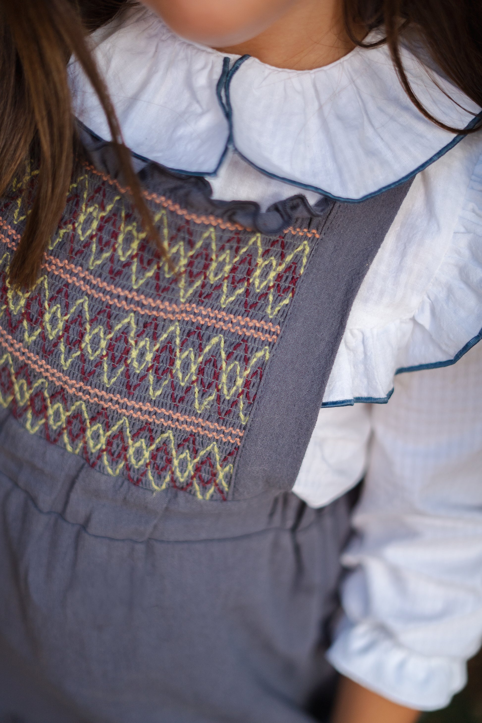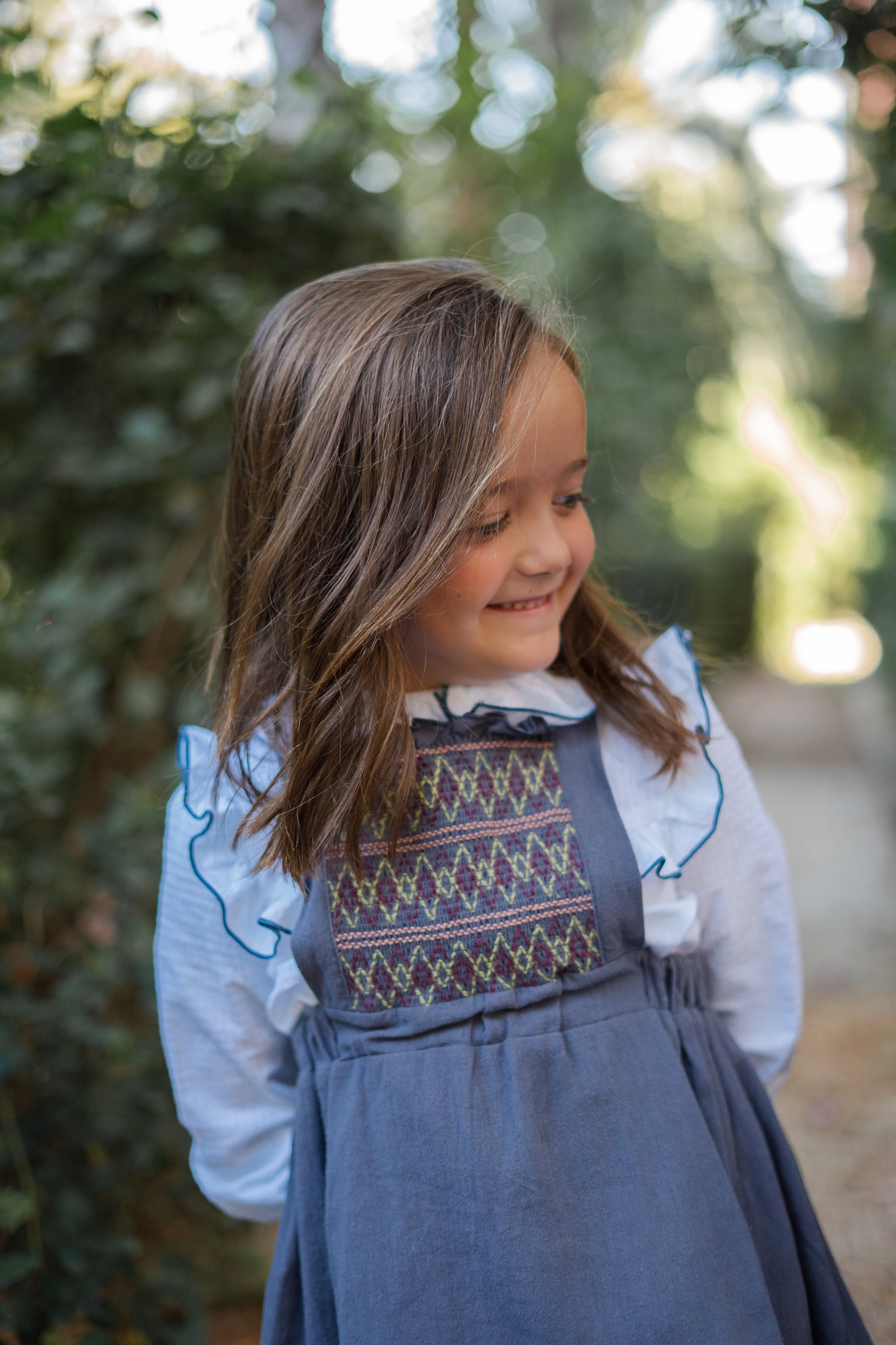 El vestido más especial de la colección. Confeccionado en 100% algodón, combina un diseño clásico con detalles únicos. Su pechera bordada a mano en nido de abeja y los volantes con vivo al tono hacen de esta prenda una auténtica joya.